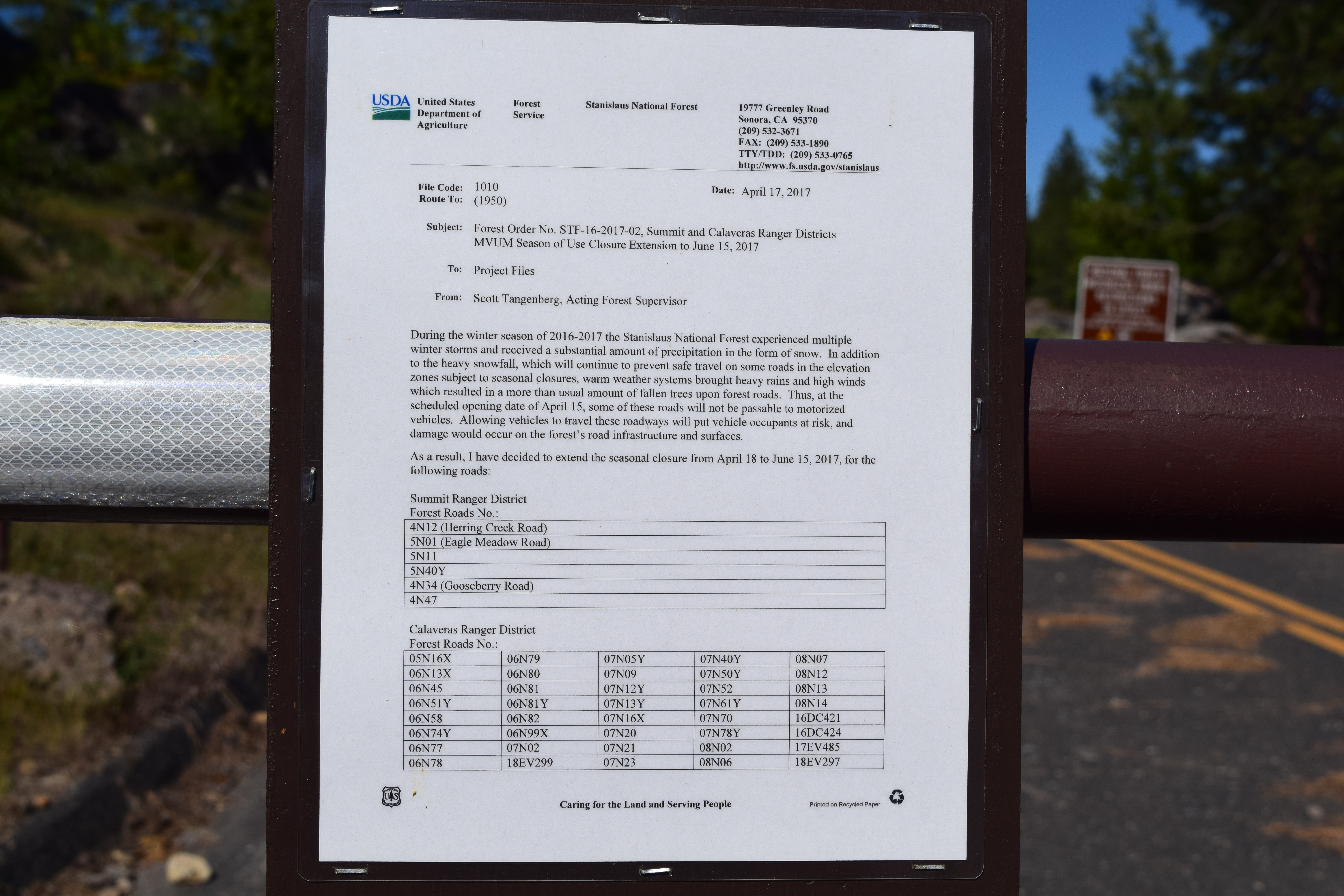 Over the weekend I went exploring in the Stanislaus National Forest. My goal was to spend some time scoping out various possible camping spots for trips later in the summer. Some of you may already know this, but I was surprised by how many of the forest roads were still closed. At one of the locked gates above Strawberry, CA this sign was posted. It lists roads that will remain closed until June 15th.